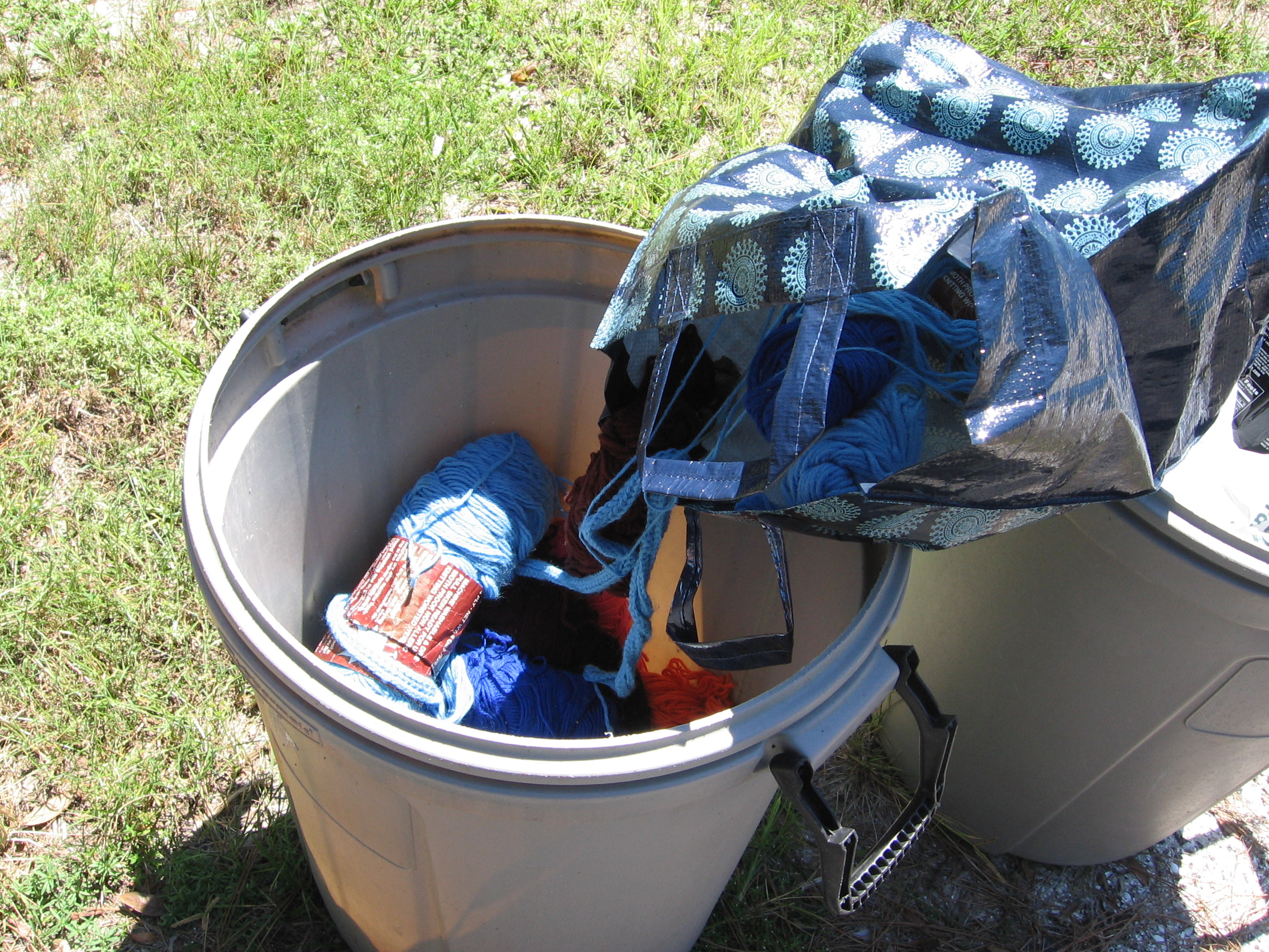 There was a smell. It didn’t go away with the cleaning of the litter box. It didn’t go away with the inspection and cleaning of the floors. It just wouldn’t go away. Then, going into the yarn room, it got WAY (crinkle your nose and pucker your butt) stronger. I start looking on the floor (as this is normally a logical place to look for such things) and happened to put my hand down on this bag of yarn to steady myself, and…..it was wet. WTF? Then I realized that the smell was coming FROM THE BAG! It was quickly taken outside and placed in the garbage can (thank God that tomorrow is garbage day!). I quickly inspected all the rest of the yarns. Most of them are in large plastic tubs and the ones that weren’t all seem to be ok (though I will have another inspection before the garbage truck arrives!). Still, peeing and pooping in my holy space. Huh. No more cats in the yarn room EVER!!!!!
