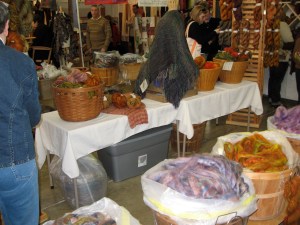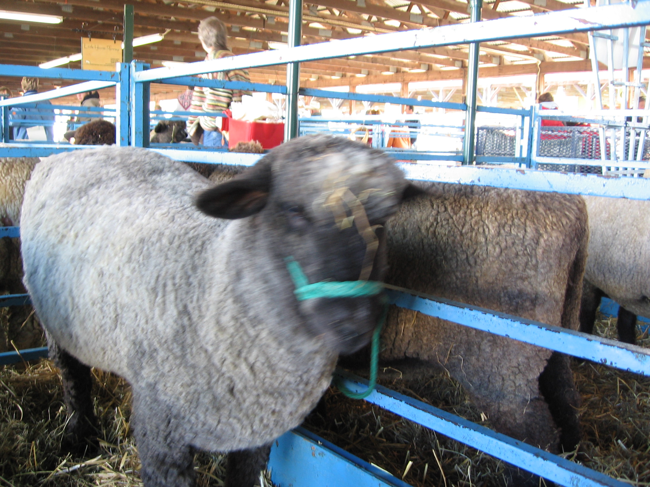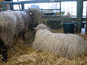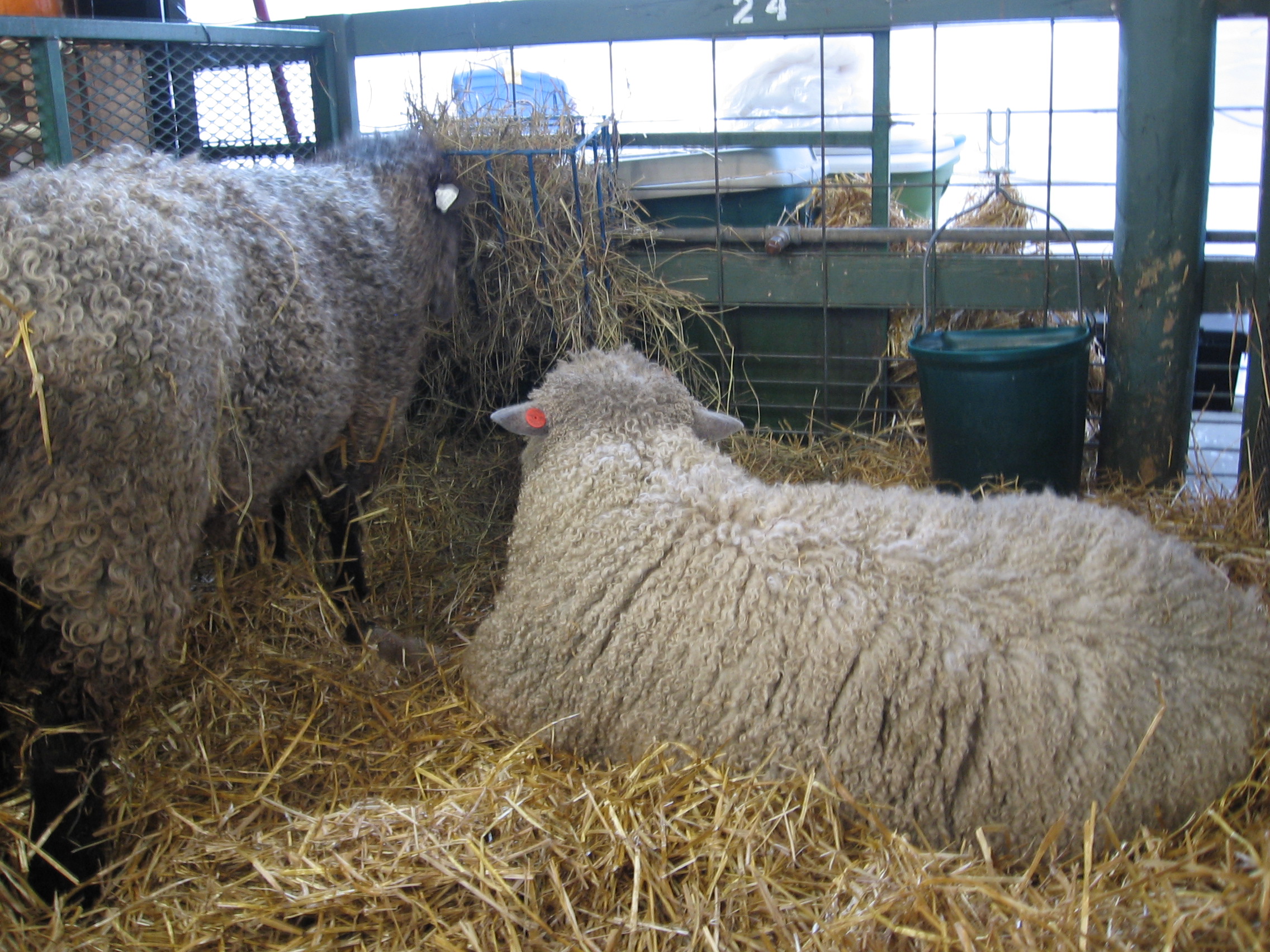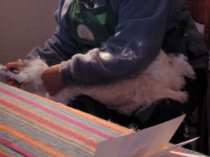 Their boy dog was positively making-out with one of the bags. There are 2 fleece and a pair of shoes in one of the bags and 2 fleece, a bunch of bags of rovings and batts , all of my clothes, all of the books (I’m ruing that decision bigtime right about now!) and all of the goodies and stuff that I got. So, yesterday, I gave you a little teaser about how I suddenly had another fleece in the stable so to speak. Late on Saturday I found an alpaca fleece that I absolutely fell in love with. It was a “low graded” one, it got a “C”. The alpaca fleeces are judged a little differently than the sheep fleeces. The sheep either get a blue sticker (really good fleece) or a red sticker (a perfectly acceptable fleece but it has some fault somewhere and there would be notes as to the fault) or, I think, no sticker. All of the fleeces that I bought were blues, though none of them had earned ribbons (that’s a blue that is the top of it’s class). So the alpacas are graded A, B, C, just like in (my) school. So, like I said, this was a “C” grade. So I asked one of the people manning the tent why. She explained to me about the grading and how that wasn’t a terribly good alpaca fleece because it didn’t have a lot of definition and crimp and, well, all the stuff that you look for in a sheep’s fleece. She admitted to me that the fleece was one of hers, and I really appreciated her honesty in disclosure. But I was totally enamored with the color (it is silver) and the price and when I asked her if it would be appropriate for blending (I was imagining it with the grey sheep’s fleece that I had already gotten that day) she said that it would. Since it was running late (I had a party to get to after all!) and I had not enough cash on hand to get it, I said that I would get it if it was still there when I got to it on Sunday.