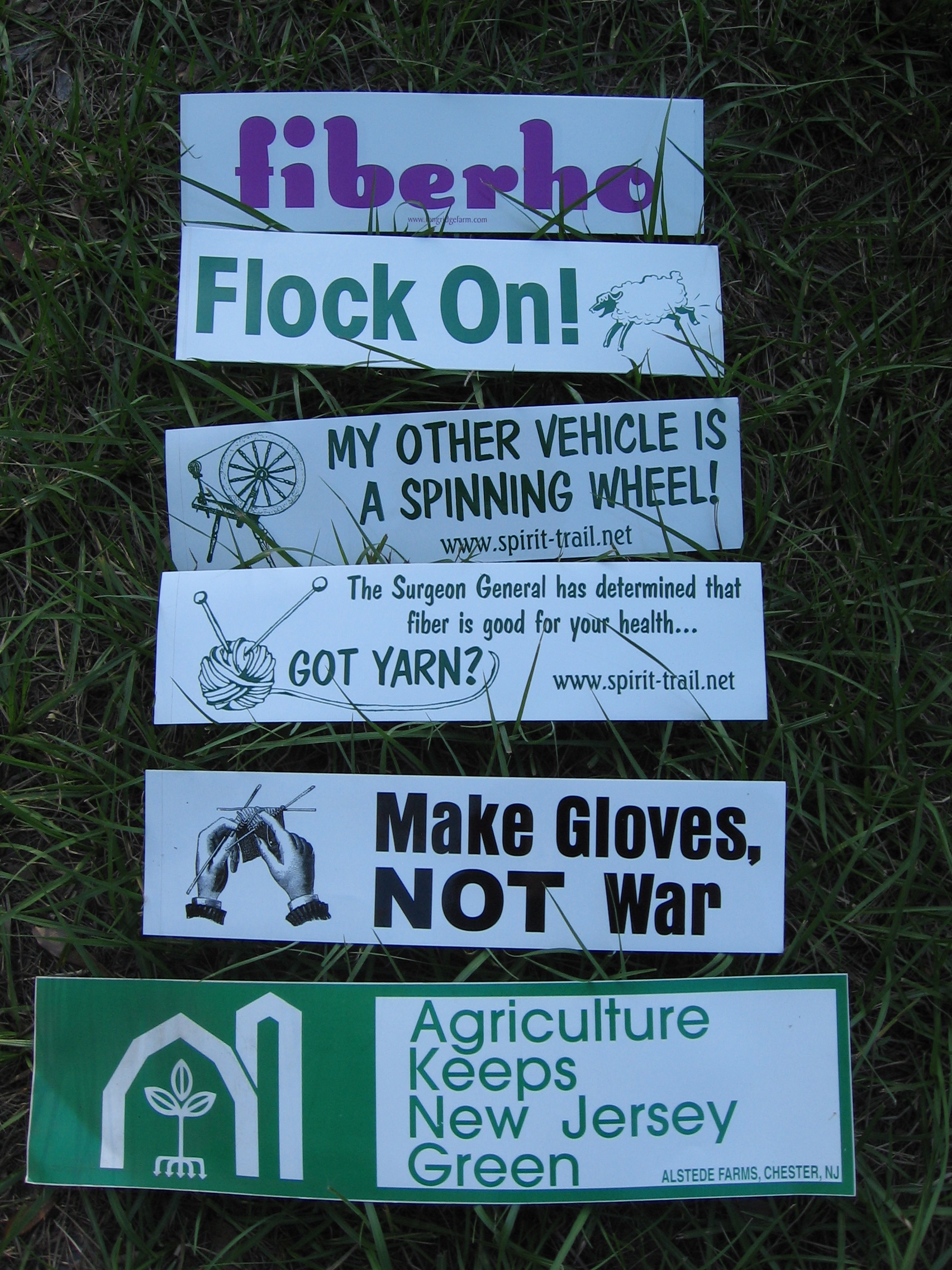 From top to bottom: Fiberho, Flock on!, My Other Vehicle is a Spinning Wheel, The Surgeon General has determined that fiber is good for your health…Got Yarn?, Make Gloves Not War, and Agriculture Keeps New Jersey Green.