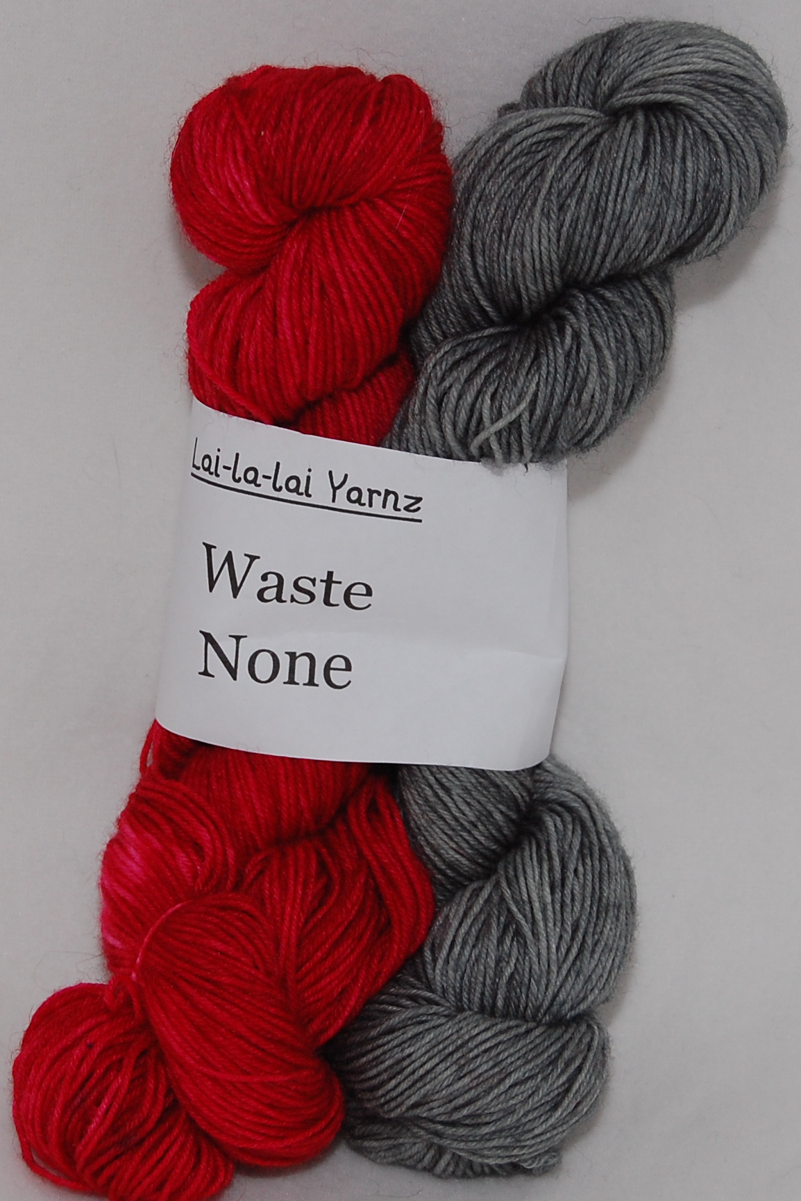 The last yarn is actually 2.  It’s a mix sock duo called Waste None and it is also from a Finnish indie dyer called Lai-la-lai Yarnz.  This dyer exhausts the dye baths with some odds and ends of sock yarn and then pairs them together.  The colors are so me once again with red and grey.  I find the idea of putting two different colors together like this fantastic!  I think that I may have to try Franklin Habit’s Looking glass socks with this yarn.