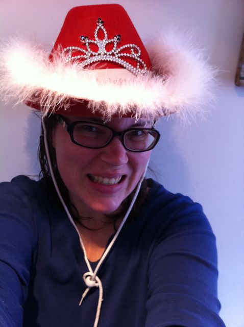 It is a red cowboy hat with marabou trim, a tiara with light-up jewels and a band that says, “Merry Christmas”.