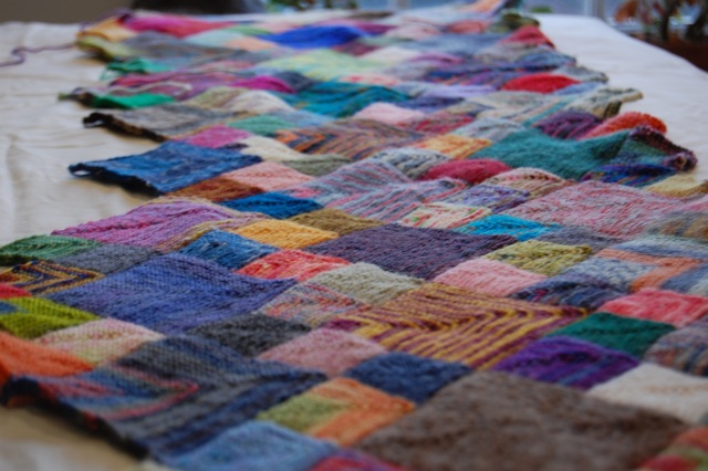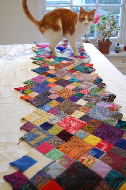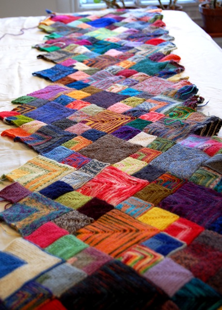 I realize that I haven’t shown you any pictures of the sock yarn blanket in a while. It continues to grow under my nurturing care, just the camera wasn’t behaving all that well. (It’s amazing how many more pictures one takes when one has a camera that is working properly!)