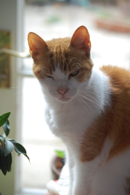 Willma is not often seen outside, except from the window behind her in this rare photo.  We aren’t sure if she is a captive or is willingly being kept in The Old Chapel.  Is the (twin) sister of Belle.  Transplanted in 2009, she was a Florida street kitten brought into “The Family” by Sarah Jane.