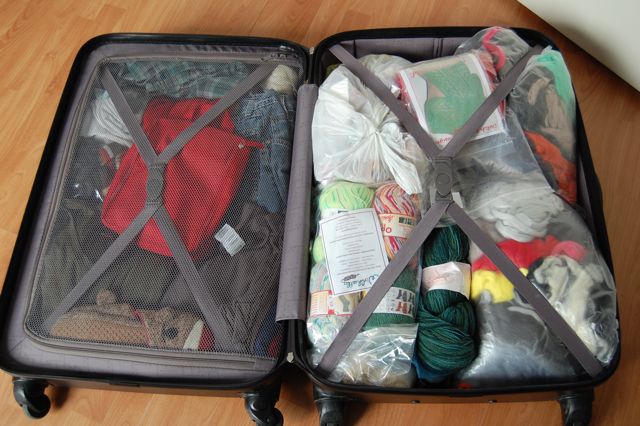 And there was shopping and fun and watching kids do insanely acrobatic things on trampolines and at gymnastics practice and a little knitting and yarn and stuff. Here’s a look at my suitcase on the way home.