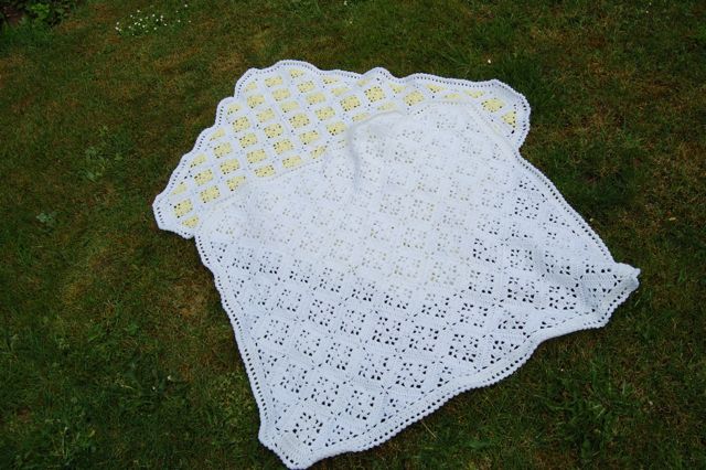 Another thing that I’ve been working on in conjunction with the hubby is a pair of baby blankets for the neighbor. Her niece just had twins this morning and she asked if I would make blankets for them. I took a big pile of books over for her to look at and she picked-out the pattern that she liked and the yarn and then I made them. I used stash yarn and they were pretty standard crochet squares. The hubby sewed them all together for me as I made them and then I crocheted the border on. They went quite fast, I think we worked on them for about a week and a half total. Good thing too as I finished them yesterday afternoon!