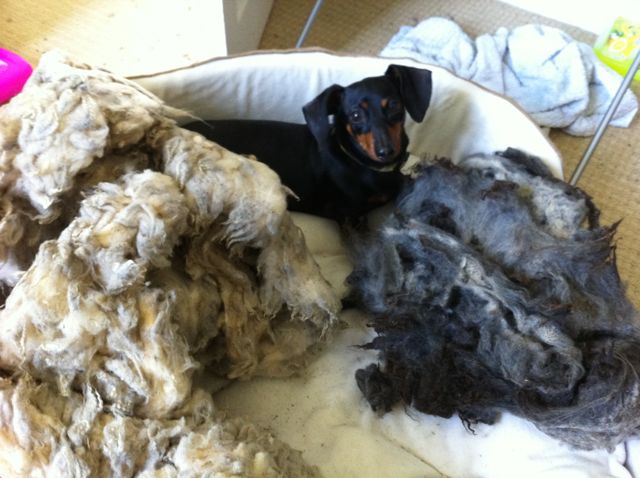 For some reason that I cannot figure out, we have a large dog bed in this bathroom. For a reason that I do know, the dog bed has become the defacto fleece sorting pen. Some of these fleeces have been sandy/peaty and there is white carpet in the bathroom. Weezy likes to sort of bury herself amongst the fleeces while I am working on them.