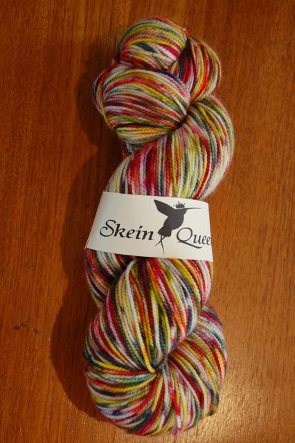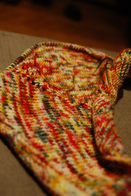 I’ve had the strongest urge to start a new project for the past few days and I’ve kept stuffing it back down saying, “When I get done with this project…”. Well, that project had to go take an emergency bath and I allowed myself to cast-on a new project. I’ve really wanted to do something with the skein of yarn that I got from the Knit Sock Club first shipment which was dyed by Skein Queen if you don’t remember. However, I really didn’t want to do socks with it. I have come to this realization that I A.) Love sock yarn, B.) Don’t really like making socks that much and C.) Really enjoy looking at sock construction. Funny huh, at least 2 of the 3 needed ingredients are there but that middle one is sort-of a doozie to get over. I mean, I love (and I mean passionately love) making tubes. If I could reasonably make tube socks, I’d be a happy camper. But it’s the turning the heel and toe shaping that make me put down the socks. It’s not that I can’t do them. I can! I’ve completed 2 pairs of socks at this time with little or no help from others. It’s just that at that point I always put them down. I think that I’m not that big on thinking about what I am knitting, much preferring to just knit. To say that I am a process knitter is a great big DUH!!!