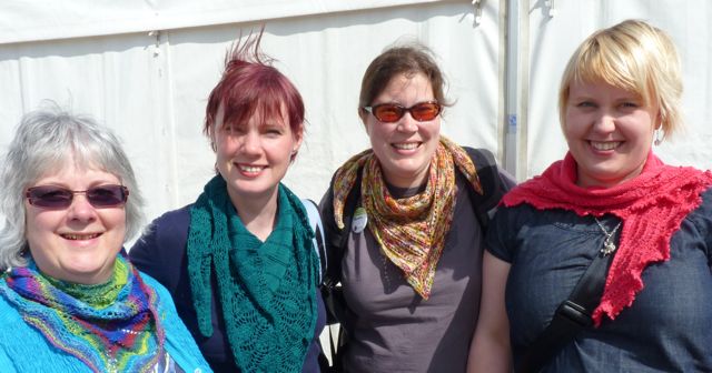 That night we went down the road to a local pub and got fish and chips for dinner then came back and knit around the fireplace until bed. The next morning we were all up bright and early in order to get into the festival first thing. We got there before it opened and waited in que with a lot of other lovely fiber folks from all over the country. One of them took a lovely photo of the 4 of us.