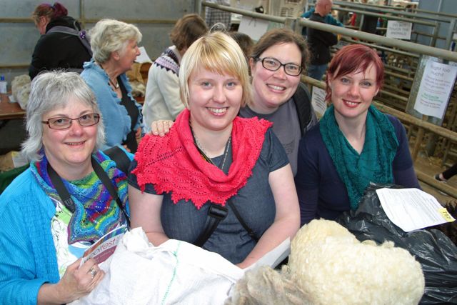Once we were inside, it was a mad rush to the fleece tables. Now really, how often do you read about a mad rush to fleece tables?? Oh how I love wool festivals! As you can imagine, there wasn’t a whole lot of picture-taking going on as the fleece area was decimated pretty quickly and we were all surrounded by 2-3′ bumpers of bags of raw wool:-) I got (ahem) rather a lot of fleeces and the ladies got a few too. I think that at one point we had 20 fleeces in the back of the car! Here is a picture of us on the 2nd day at one of the fleece sorting tables: