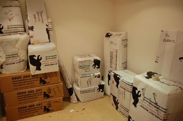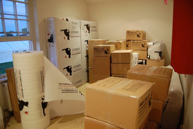 3 pm The moving gents have left for the day having filled two more of the big wooden crates with stuff. Mal is thoroughly enjoying the amount of space that he now has to run about the house in! Plus, all the dogs are on double (ok triple) treat rations as they have a lot of yummies left and I can’t take them with me:-)
