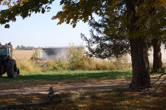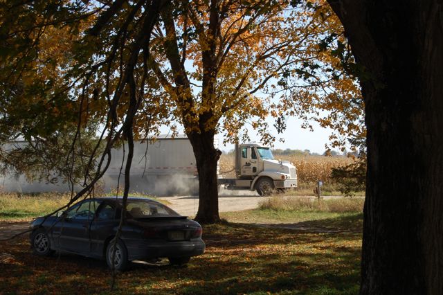 One of the bad parts of harvest time is the grain trucks. These are semis that haul grain from the fields to the elevators. There’s nothing wrong with the trucks or the folks driving them in themselves, it’s the amount of dust that they kick-up on the road. Even the dust isn’t really their fault, it’s just that it’s dry and the road gets dusty. But the fact that there are probably a dozen of them going by each hour makes it so that everything outside is covered in a fine sifting of beige dust.