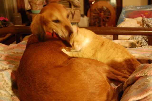 Malcolm isn't even resistant to the charms of a kitten. This is the kitten "making biscuits" or "noodling" or "pretend nursing" on Mal. She also sleeps on top of him!