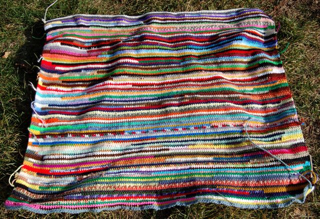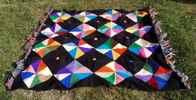 It’s completely knitted garter stitch with a much larger assortment of yarns in the tassels on the ends than are in the blanket. There are at least 3 shades of Caron Dazzleaire worked into it that I ever knew existed. And it is bright. Really bright. Just check out the assortment of yarns in the tassels!