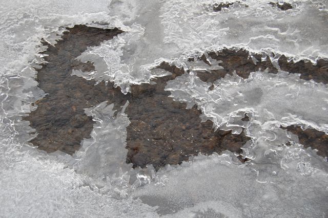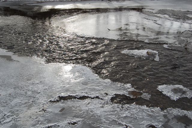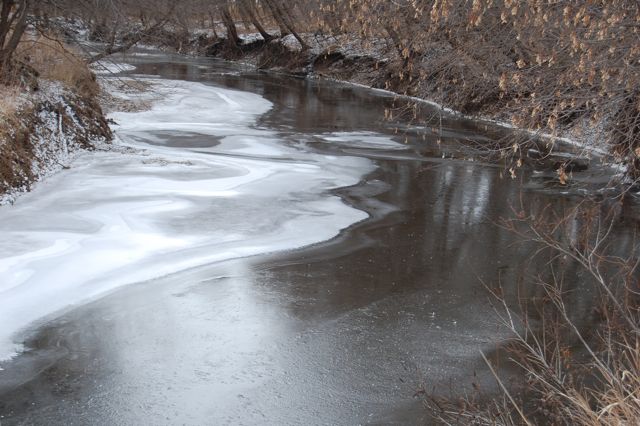 The creek is only partially frozen. There is still moving water in parts of it while it is completely frozen over in other areas.