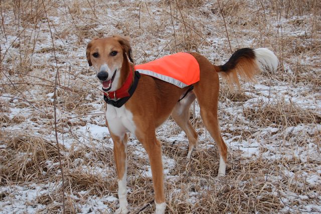 Malcolm wears his “please don’t shoot me hunters, I’m a dog” vest every time we go further than the front yard now. There are often many shots heard from deer hunters in all directions. There “shouldn’t” be any hunters on the land we are walking on, but I feel better with him geared-up like this. Plus it makes him a lot easier to find in this brown/white landscape!