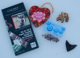 There was 2 different chocolate bars along with a package of tiny dog themed buttons, a hand painted heart ornament, a ceramic fox button and a little tractor themed pot watcher!