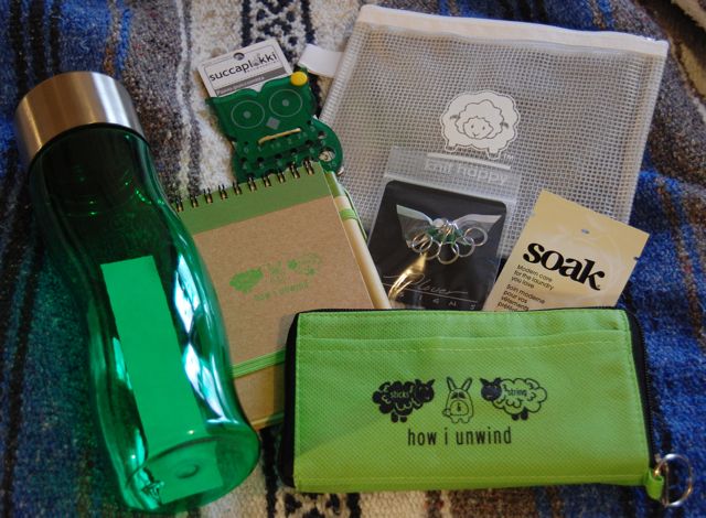 The bag itself is the green zippered wallet looking thing on the lower right.  It unfolds into a nice-sized tote!  There is also a water bottle, a needle sizer from one of my favorite knitting supply companies Succaplokki, a little notebook and pen, a set of stitch markers made from recycled aluminum by Plover Designs, a Soak sample and a cute little zippered pouch that says “Knit Happy”.  There was also a passel of papers in there with various knitting patterns as well as coupons for various vendors.  We were also given a monster sized Lion Brand tote bag, but I’ve already put it away and I’m too lazy to get it back out:-)  However, it is large enough to easily carry around a full-sized blanket in progress!