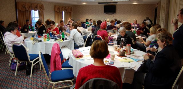 The next morning, we all met in the big conference room area.  There were a lot more knitters this time around as we pretty much filled-up the room.  We had a “getting to know you” bingo game which was fun.  There were talks about all sorts of things going on in the breakfast room next door including charity knitting, how to tame your yarn and tips on how to repurpose old sweaters.  In the main conference room, there was sitting and knitting and spinning (I didn’t spin too much as I felt like I was ignoring my table mates by doing so!).  It looked about like this: