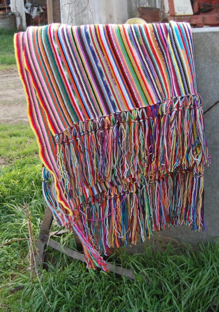 It’s a little different from my usual version in that I experimented with fringe.  I think that it adds a bit of a playful aesthetic to it, but I doubt that I will do it again.  It just got in the way a lot and was really time-consuming in the end.  It’s going to be raffled off by the Ackley American Legion Auxiliary in the coming months as a fundraiser.