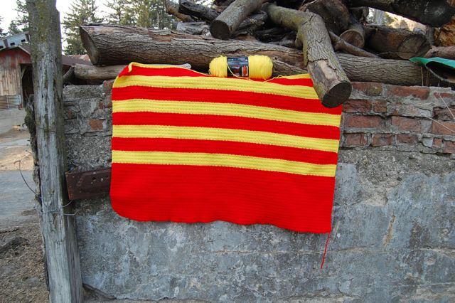 I thought for sure that it was headed for the frog pond because I couldn’t find any more of the red yarn.  I looked in Michael’s and JoAnn’s and Hobby Lobby and not one of them carried this particular shade of red.  Guess where I found it.  Wal-Mart.  I detest going into that store, but it’s really the only thing sort-of local and while I was in there looking for something else I just moseyed down the yarn aisle and there it was, bright as day, just sitting there!  It’s a good thing I really didn’t want to rip it out as now I have enough yarn to finish the blanket!  Woot woot!  And, I am planning on taking a little weekend trip out to Chicago to see Sarah and her crew in the next few weeks so hopefully I will have it finished by the time I get there and can give it to the little guy in person.  Just in time for summer…