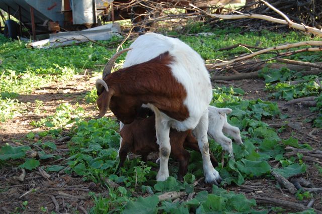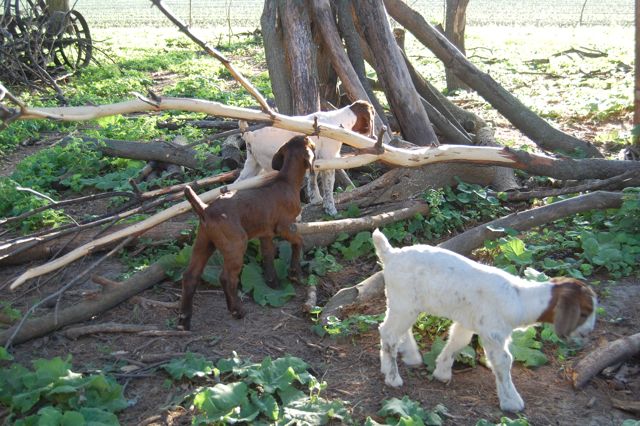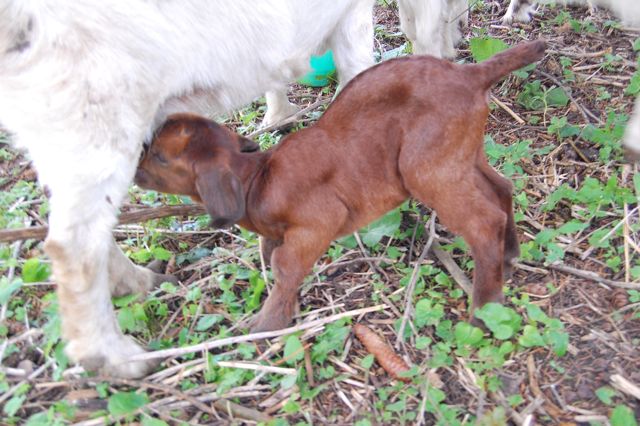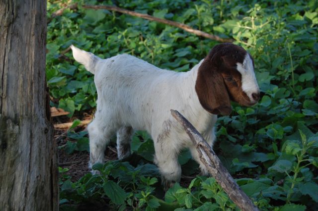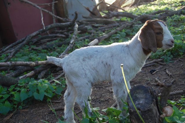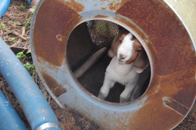 We’ve also had a second explosion of baby goats! Around May first, there were 5 new kids on the block born to 2 mothers. The triplets were born to a goat who has looked uncomfortably pregnant since about February and the twins were born to one that no-one knew was pregnant. Surprise! The triplets were all born super healthy and doing good but the twins were sort of a different story. There was one boy who came out huge and all red and one boy who was super tiny and the more normal white and red. We all pretty much figured that the little one wasn’t going to make it (he was about half the size of the other twin) but he’s more feisty than we gave him credit for and he’s been doing well. He’s actually a master of finding hiding places in the old equipment dad has stored out in the grove.