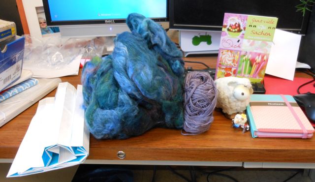 In it was a sweet birthday card, 2 cutie sheep figurines, some lush spinning fiber, a bit of leftover sock yarn for my blanket and a little notebook that I am going to use to keep my spinning notes in, and a bunch of Tyvek bracelets like what you get when you go to a club or an event. They are for marking yardage and such on skeined-up yarn that you are then going to wash. Brilliant!