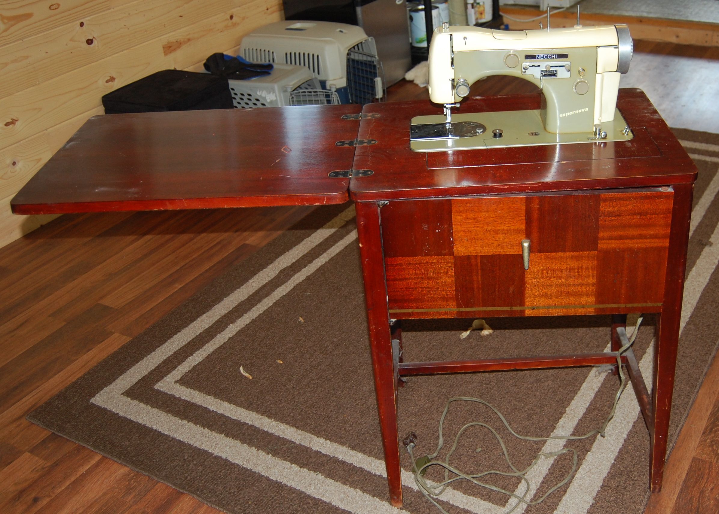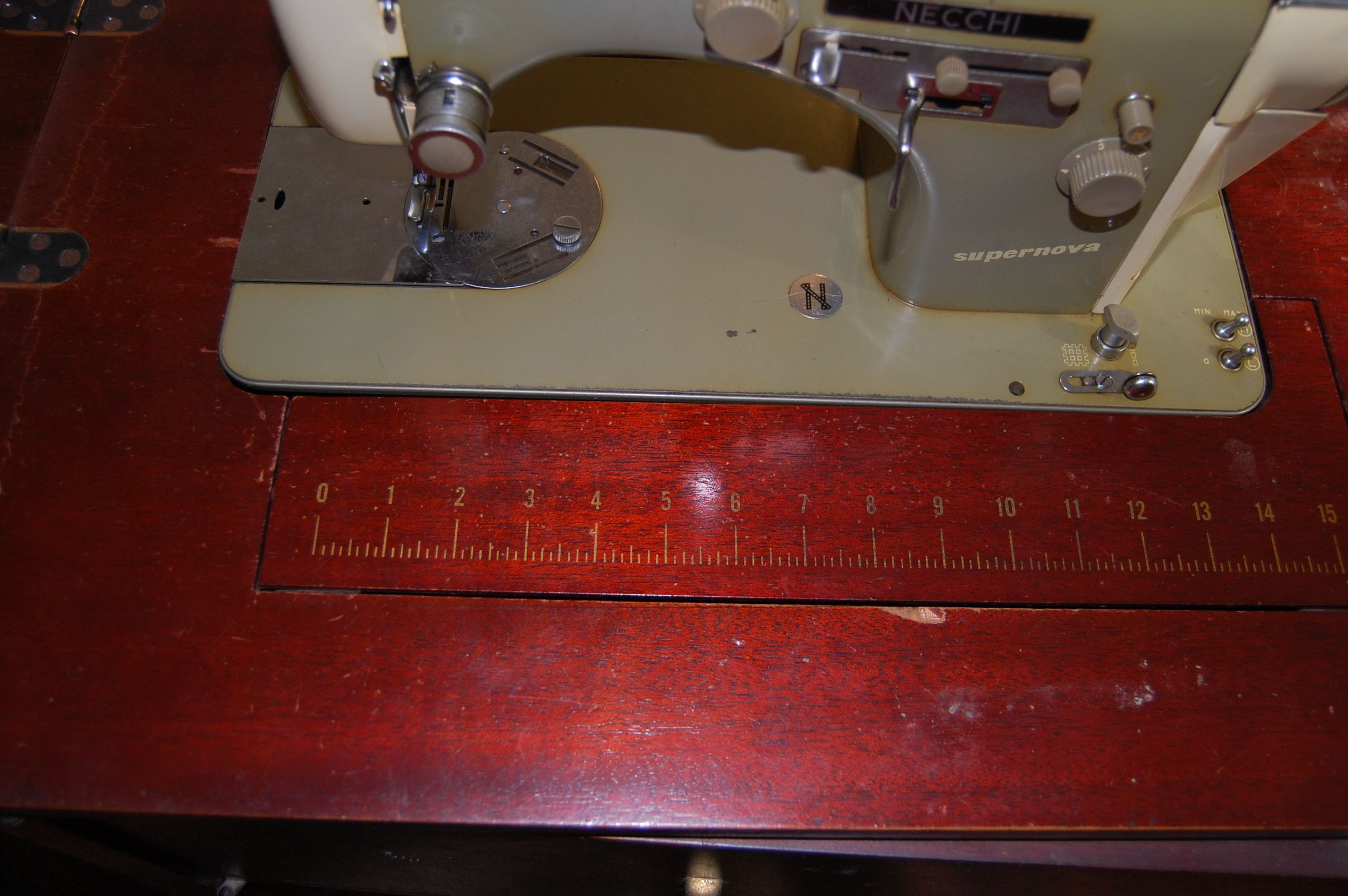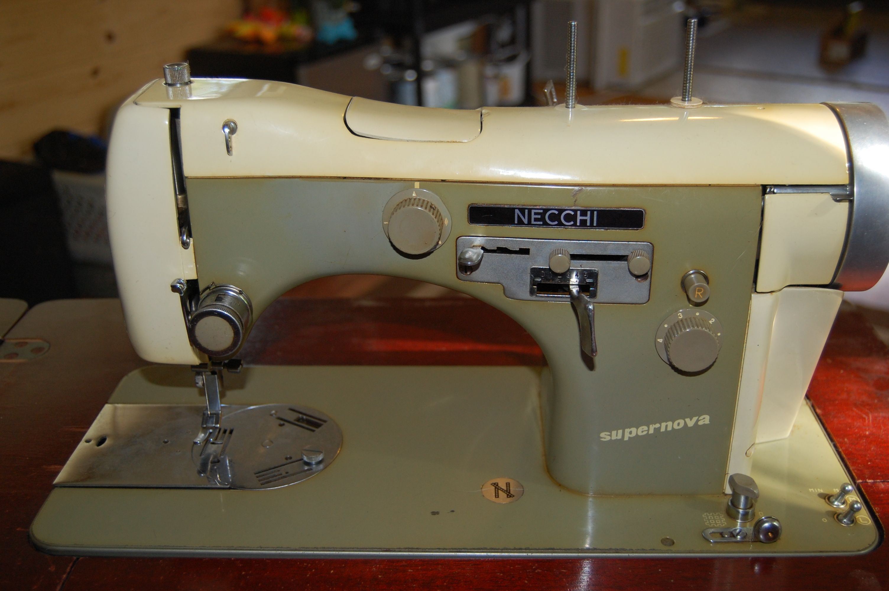 It’s an antique Necchi, which when I did a little research, I found out is an Italian brand that was really mostly known for their industrial machines, but that they also made really excellent machines for the home as well. These still go for $100’s of dollars in working condition, which this one is. They are known as very tough machines.  Yay for me being a garbage hound!  I did replace the power cord, as the one on it looked like it had been melted time and again and made me very nervous.