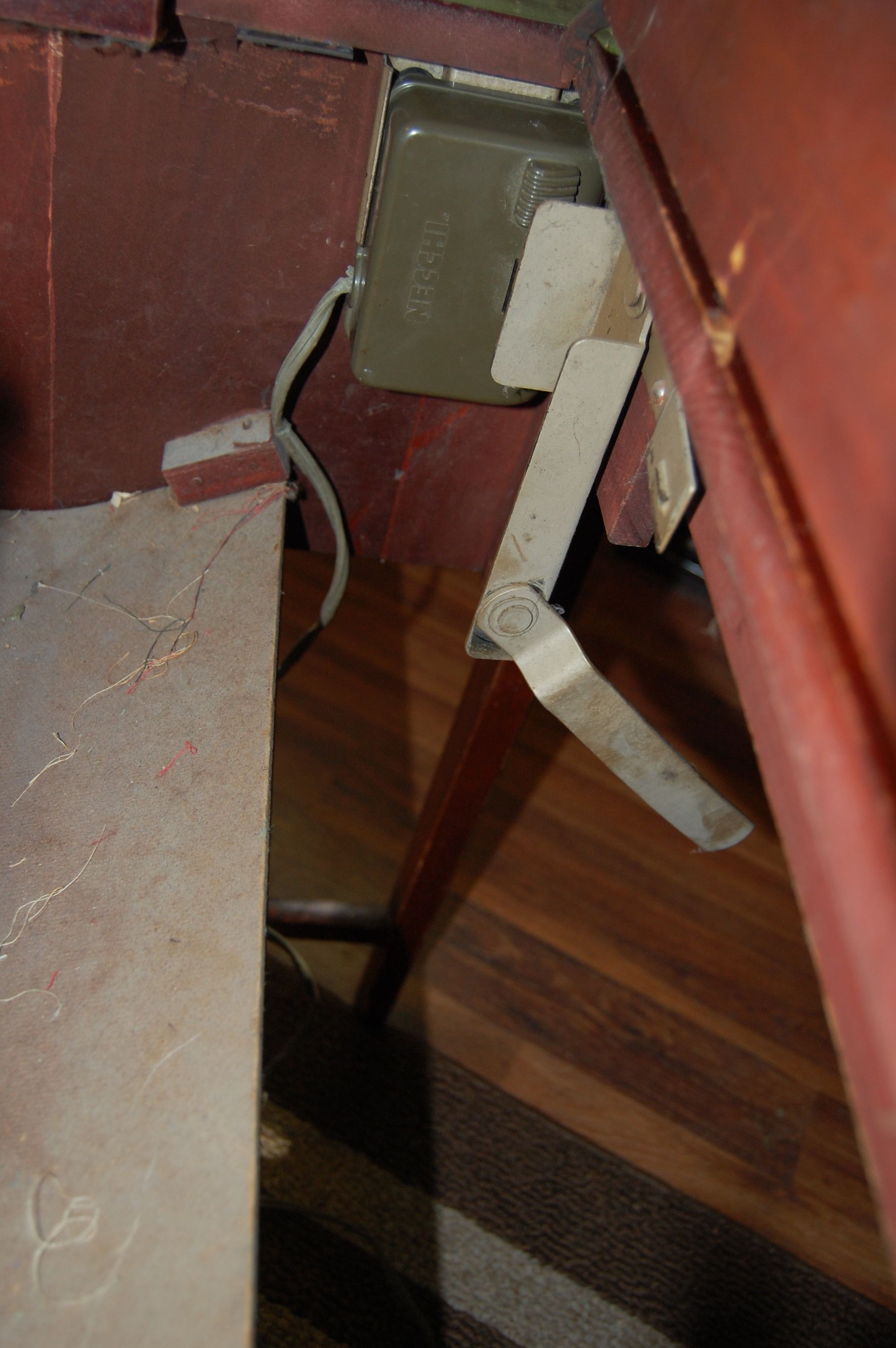 There is a little spot in the cabinet where you can slide the foot peddle into it and there is a lever that opens out so that you can control it with your knee!
