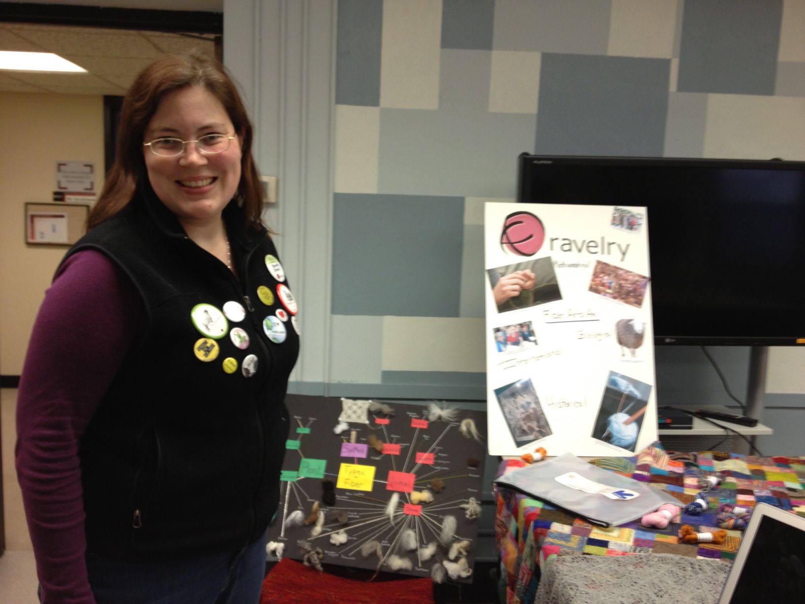 I’m wearing buttons from various meetings and events I have attended. There is also a “concept map” about fiber in the background that I made for another class.