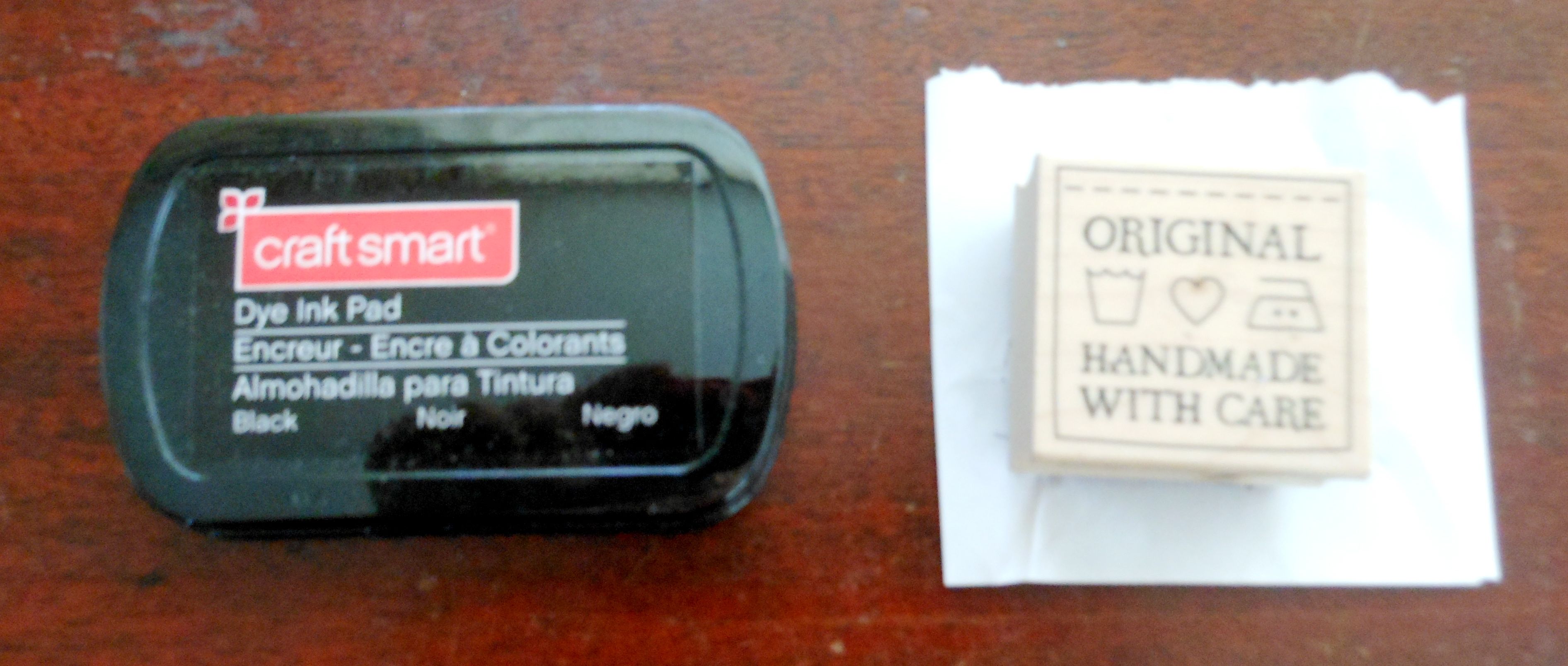 I also have this lovely stamp that says, “Original Handmade With Care” on it. I got it a while ago at Michael’s on clearance. You don’t even need to use one like this. If you see a stamp that you think is nice and it fits, go for it! I also snagged the black ink pad for $1. I’ve seen stamps like this before, in fact I think I have one that even says “Handmade by:” on it somewhere in my storage unit.
