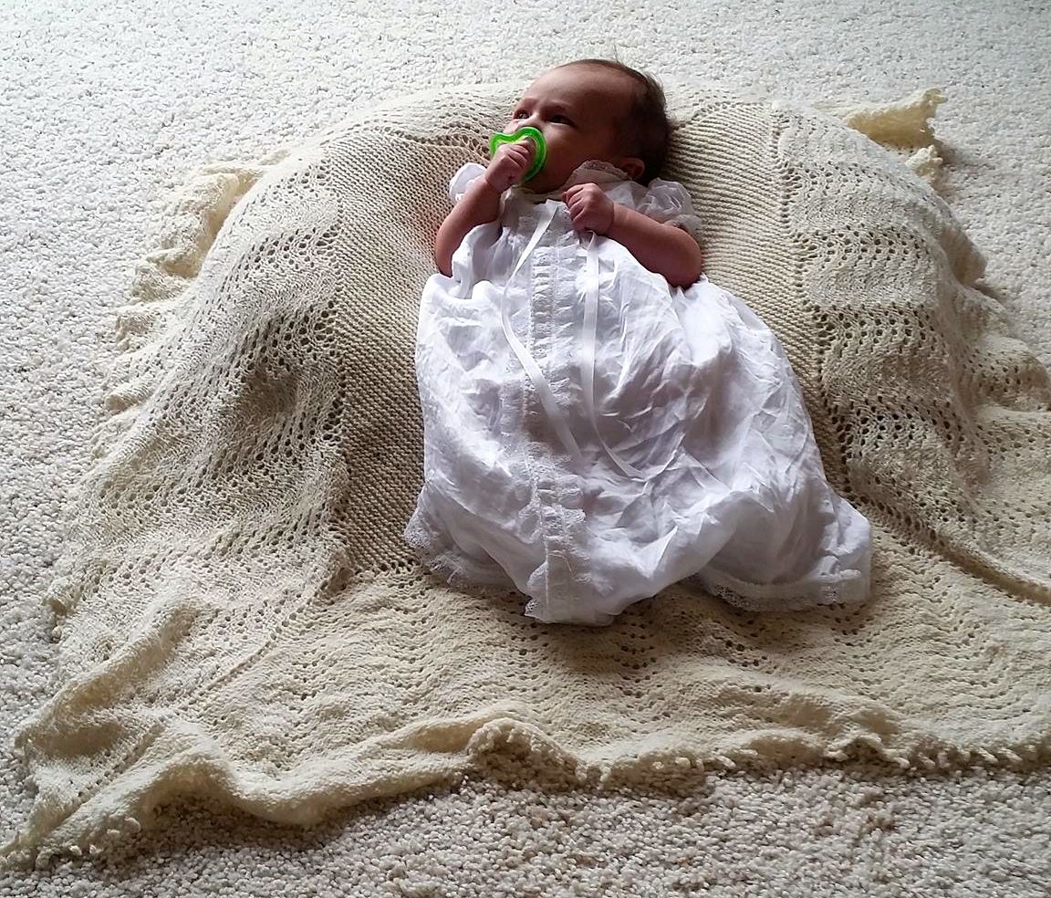 Luckily it was one of those super easy things to block and all I had to do was kind of pat it into place and let it dry for a bit. I have a heated bed so that helped to move things along a bit:-) It was dry and ready for the baptism that morning.