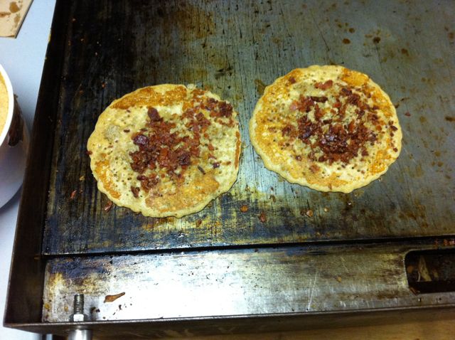 So, in answer to your semi-snorted question, speckendicken is a meat pancake. Or, to me slightly more precise, it is a (usually) whole wheat pancake that has meat added to it during the cooking. In the case of the speckendicken that had for breakfast it was crumbled bacon and sausage. It can also have anise added as a flavoring. I’ll be the first to admit, it sounds a little disturbing when you hear it described, but it’s actually quite tasty!